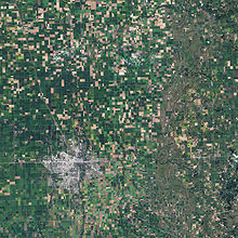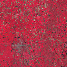 Infrared image of the above farms. To the untrained eye, this image appears a hodge-podge of colours without any apparent purpose. But farmers are now trained to see yellows where crops are infested, shades of red indicating crop health, black where flooding occurs, and brown where unwanted pesticides land on chemical-free crops.