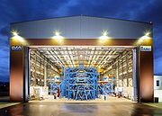 The front and rear sections of the fuselage are loaded on an Airbus Roll-on/roll-off (RORO) ship, Ville de Bordeaux, in Hamburg in northern Germany, whence they are shipped to the United Kingdom. The wings, which are manufactured at Filton in Bristol and Broughton in North Wales, are transported by barge to Mostyn docks, where the ship adds them to its cargo. In Saint-Nazaire in western France, the ship trades the fuselage sections from Hamburg for larger, assembled sections, some of which include the nose. The ship unloads in Bordeaux. Afterwards, the ship picks up the belly and tail sections by Construcciones Aeronáuticas SA in Cádiz in southern Spain, and delivers them to Bordeaux. From there, the A380 parts are transported by barge to Langon, and by oversize road convoys to the assembly hall in Toulouse. New wider roads, canal systems and barges were developed to deliver the A380 parts. After assembly, the aircraft are flown to Hamburg, XFW to be furnished and painted. It takes 3,600 litres (950 gallons) of paint to cover the 3,100 m² (33,000 ft²) exterior of an A380.