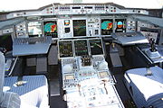Airbus used similar cockpit layout, procedures and handling characteristics to those of other Airbus aircraft, to reduce crew training costs. Accordingly, the A380 features an improved glass cockpit, and fly-by-wire flight controls linked to side-sticks. The improved cockpit displays feature eight 15-by-20 cm (6-by-8-inch) liquid crystal displays, all of which are physically identical and interchangeable. These comprise two Primary Flight Displays, two navigation displays, one engine parameter display, one system display and two Multi-Function Displays. These MFDs are new with the A380, and provide an easy-to-use interface to the flight management system—replacing three multifunction control and display units. They include QWERTY keyboards and trackballs, interfacing with a graphical " point-and-click" display navigation system.