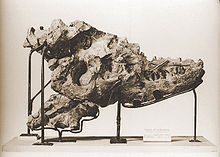 The type specimen is a partial skull, collected in the summer of 1884 from an outcrop of the Horseshoe Canyon Formation alongside the Red Deer River, in Alberta. This specimen, found on June 9, 1884, was recovered by an expedition of the Geological Survey of Canada, led by the famous geologist Joseph Burr Tyrrell. Due to a lack of specialised equipment the almost complete skull could only be partially secured. In 1889, Tyrell's colleague Thomas Chesmer Weston found an incomplete smaller skull associated with some skeletal material at a location nearby. The two skulls were assigned to the preexisting species Laelaps incrassatus by Edward Drinker Cope in 1892, although the name Laelaps was preoccupied by a genus of mite and had been changed to Dryptosaurus in 1877 by Othniel Charles Marsh. Cope refused to recognize the new name created by his archrival Marsh, however, Lawrence Lambe instead of Laelaps incrassatus used the name Dryptosaurus incrassatus when he described the remains in detail in 1903 and 1904, a combination first coined by Oliver Perry Hay in 1902. Shortly later, Osborn pointed out that D. incrassatus was based on generic tyrannosaurid teeth, so the two Horseshoe Canyon skulls could not be confidently referred to that species. The Horseshoe Canyon skulls also differed markedly from the remains of D. aquilunguis, type species of Dryptosaurus, so Osborn created the new name Albertosaurus sarcophagus for them in 1905. He did not describe the remains in any great detail, citing Lambe's complete description the year before. Both specimens (the holotype CMN 5600 and the paratype CMN 5601) are stored in the Canadian Museum of Nature in Ottawa. By the early twenty-first century some concerns had arisen that, due to the damaged state of the holotype, Albertosaurus might be a nomen dubium, a "dubious name" that could only be used for the type specimen itself because other fossils could not reliably be assigned to it. However, in 2010 Thomas Carr established that the holotype, the paratype and comparable later finds all shared a single common unique trait or autapomorphy: the possession of an enlarged pneumatic opening in the back rim of the side of the palatine bone, proving that Albertosaurus was a valid taxon.