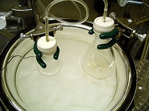 Both flasks are submerged in a dry ice/acetone cooling bath (-78 °C) the temperature of which is being monitored by a thermocouple (the wire on the left).