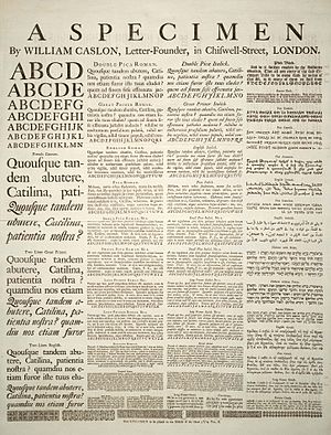 A Specimen of typeset fonts and languages, by William Caslon, letter founder; from the 1728 Cyclopaedia.