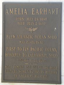 Amelia Mary Earhart ( / ˈ ɛər h ɑr t / AIR-hart; July 24, 1897 – disappeared July 2, 1937) was an American aviation pioneer and author. Earhart was the first female pilot to fly solo across the Atlantic Ocean. She received the U.S. Distinguished Flying Cross for this record. She set many other records, wrote best-selling books about her flying experiences and was instrumental in the formation of The Ninety-Nines, an organization for female pilots. Earhart joined the faculty of the Purdue University aviation department in 1935 as a visiting faculty member to counsel women on careers and help inspire others with her love for aviation. She was also a member of the National Woman's Party, and an early supporter of the Equal Rights Amendment.