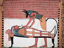 Anubis was the ancient Egyptian god associated with mummification and burial rituals; here, he attends to a mummy.