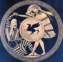 Greek hoplite and Persian warrior depicted fighting, on an ancient kylix, 5th century BC
