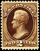 Andrew Jackson is one of the few American presidents ever to appear on US Postage more than the usual two or three times. He died in 1845, but the U.S. Post Office did not release a postage stamp in his honour until 18 years after his death, with the issue of 1863, a 2-cent black issue, commonly referred to by collectors as the ' Black Jack'. In contrast, the first Warren G. Harding stamp was released only one month after his death, Lincoln, one year exactly. As Jackson was a controversial figure in his day there is speculation that officials in Washington chose to wait a period of time before issuing a stamp with his portrait. In all, Jackson has appeared on thirteen different U.S. postage stamps, more than that of most US presidents and second only to the number of times Washington, Franklin and Lincoln have appeared. During the American Civil War the Confederate government also issued two Confederate postage stamps bearing Jackson's portrait, one a 2-cent red stamp and the other a 2-cent green stamp, both issued in 1863.