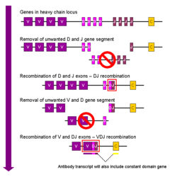 Somatic recombination of immunoglobulins, also known as V(D)J recombination, involves the generation of a unique immunoglobulin variable region. The variable region of each immunoglobulin heavy or light chain is encoded in several pieces - known as gene segments. These segments are called variable (V), diversity (D) and joining (J) segments. V, D and J segments are found in Ig heavy chains, but only V and J segments are found in Ig light chains. Multiple copies of the V, D and J gene segments exist, and are tandemly arranged in the genomes of mammals. In the bone marrow, each developing B cell will assemble an immunoglobulin variable region by randomly selecting and combining one V, one D and one J gene segment (or one V and one J segment in the light chain). As there are multiple copies of each type of gene segment, and different combinations of gene segments can be used to generate each immunoglobulin variable region, this process generates a huge number of antibodies, each with different paratopes, and thus different antigen specificities.