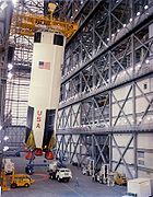 The first stage of AS-503 being erected in the Vehicle Assembly Building (VAB) on February 1, 1968