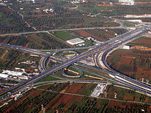 Athens' Metropolitan Area is served by the motorway network of the Attiki Odos toll-motorway (code: A6). Its main section extends from the western industrial suburb of Elefsina to Athens International Airport; while two beltways, namely the Aigaleo Beltway (A65) and the Hymettus Beltway (A64) serve parts of western and eastern Athens respectively. The span of the Attiki Odos in all its length is 65 km (40 mi), making it the largest metropolitan motorway network in all of Greece.