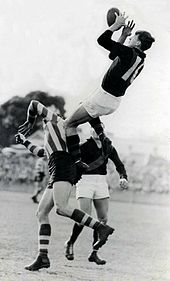 Marking (catching) the ball is an important skill. (Pictured: Essendon great John Coleman takes a specky in 1950.)