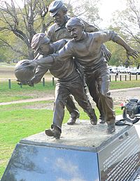 A statue next to the Melbourne Cricket Ground on the approximate site of the 1858 "foot-ball" match between Melbourne Grammar and Scotch College. Tom Wills is depicted umpiring behind two young players contesting the ball. The plaque reads: "Wills did more than any other person – as footballer and umpire, co-writer of the rules and promoter of the game – to develop Australian Football during its first decade."
