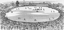A game at the Richmond Paddock in the 1860s. A pavilion at the MCG is on the left in the background. (A wood engraving made by Robert Bruce on 27 July 1866.)