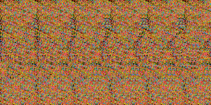 The simplest type of autostereogram consists of horizontally repeating patterns and is known as a wallpaper autostereogram. When viewed with proper vergence, the repeating patterns appear to float above or below the background. The Magic Eye books feature another type of autostereogram called a random dot autostereogram. One such autostereogram is illustrated above right. In this type of autostereogram, every pixel in the image is computed from a pattern strip and a depth map. Usually, a hidden 3D scene emerges when the image is viewed with the correct vergence.