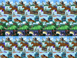 The following wall-eyed autostereogram encodes 3 planes across the x-axis. The background plane is on the left side of the picture. The highest plane is shown on the right side of the picture. There is a narrow middle plane in the middle of the x-axis. Starting with a background plane where icons are spaced at 140 pixels, one can raise a particular icon by shifting it a certain number of pixels to the left. For instance, the middle plane is created by shifting an icon 10 pixels to the left, effectively creating a spacing consisting of 130 pixels. The brain does not rely on intelligible icons which represent objects or concepts. In this autostereogram, patterns become smaller and smaller down the y-axis, until they look like random dots. The brain is still able to match these random dot patterns.