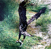 The incubation period averages at about 35 days and the parents will brood their offspring until they are about four weeks of age. The fledging stage can occur at any time from 70 to 92 days, the wide variation dictated by the effects of sex and hatching order on growth and development. Egg and nestling predation may be committed by Black-billed Magpies, gulls, ravens and crows, black bears and raccoons. With no known predators themselves, adults will fiercely defend their offspring from these species.