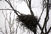 The nest is the largest of any bird in North America; it is used repeatedly over many years and with new material added each year may eventually be as large as 4 meters (13 ft) deep, 2.5 meters (8 ft) across and weigh one tonne (1.1 tons); one nest in Florida was found to be 6.1 meters deep (20 ft), 2.9 meters (9.5 ft) across, and to weigh 2.722 tonnes (3 tons). The nest is built out of branches, usually in large trees near water. When breeding where there are no trees, the Bald Eagle will nest on the ground. Eagles produce between one and three eggs per year, but it is rare for all three chicks to successfully fly. Both the male and female take turns incubating the eggs. The other parent will hunt for food or look for nesting material. The eggs average about 7.3 centimeters (2.9 in) long and have a breadth of 5.5 centimeters (2.2 in).