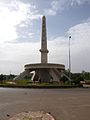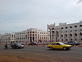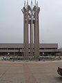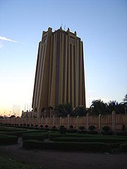 The BCEAO Tower at 20 storeys is the tallest building in the West African nations. It sits of the north ("right") bank of the River Niger in the city centre of Bamako. The BCEAO Tower is the Malian headquarters of the Central Bank of West African States, which provides development banking and government financial and currency services in several Francophone West African nations. Classified as Neo-Sudanic architecture, it is modeled on the Sudano-Sahelian architecture of the famous mosques of Djenne and Timbuktu. The building is located in the busy Commune III neighbourhood, where "Avenue Moussa Tavele" meets the waterside boulevard between the two main Bamako bridges : King Fahd Bridge a block west and Martyrs Bridge three blocks east. Just to the east of the BCEAO complex, a park and formal garden marks where the diagonally running "Boulevard du Peuple" reaches the river. By contrast, small market gardens and launching points or river canoes lie along the river front. With the Hotel de l'Amitié and the Bamako Grand Mosque, the BCEAO Tower is one of three landmarks visible across most of the city. Also of note is the Bamako Cathedral.