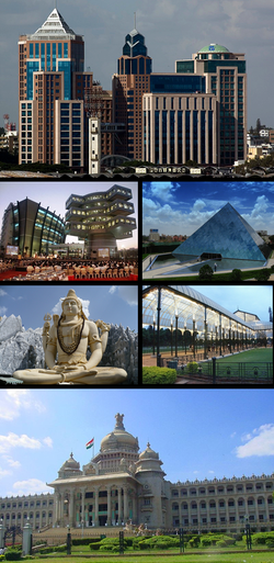 Clockwise from top: UB City, Infosys, Glass house at Lal Bagh, Vidhana Soudha, Shiva statue, Bagmane Tech Park