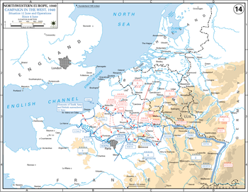 ![]() Clockwise from top left: German Panzer IV tanks passing through a town in France; German soldiers marching past the Arc de Triomphe after the surrender of Paris, 14 June 1940; Column of French Renault R35 tanks at Sedan, Ardennes; British and French prisoners at Veules-les-Roses; French soldiers on review within the Maginot Line fortifications.  |