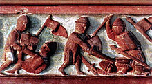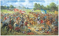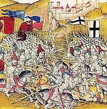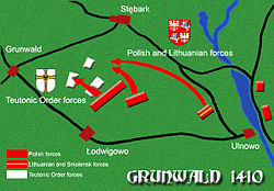 The Battle of Grunwald or First Battle of Tannenberg (German: Schlacht bei Tannenberg) was fought on 15 July 1410, during the Polish–Lithuanian–Teutonic War. The alliance of the Kingdom of Poland and the Grand Duchy of Lithuania, led respectively by King Jogaila (Władysław Jagiełło) and Grand Duke Vytautas (Witold), decisively defeated the German-Prussian Teutonic Knights, led by Grand Master Ulrich von Jungingen. Most of the Teutonic Knights' leadership were killed or taken prisoner. While defeated, the Teutonic Knights withstood the siege on their fortress in Marienburg ( Malbork) and suffered only minimal territorial losses at the Peace of Thorn (1411) ( Toruń). Territorial disputes continued until the Peace of Melno was concluded in 1422. However, the Knights never recovered their former power and the financial burden of war reparations caused internal conflicts and an economic downturn in their lands. The battle shifted the balance of power in Eastern Europe and marked the rise of the Polish–Lithuanian union as the dominant political and military force in the region.
