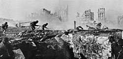 ![]() Soviet soldier waving the Red Banner over the central plaza of Stalingrad in 1943. |