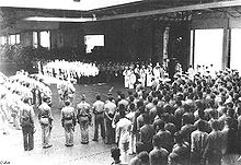 Japanese cruiser Chikuma under attack on 26 October. The white spot in the centre of the ship is where a 1,000 lb (450 kg) bomb hit directly on the bridge, causing heavy damage and high casualties.