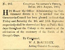 The Battle of St. George's Caye was a short military engagement that lasted from 3–30 September 1798, undertaken off the coast of what is now Belize. The name, however, is typically reserved for the final battle that occurred on 10 September. The British first appointed a superintendent over the Belize area in 1786. Prior to that time, the British government did not initially recognize the settlement in Belize as a colony for fear of provoking a Spanish attack. The delay in government oversight allowed the settlers to establish their own laws and forms of government. During this period, a few wealthy settlers gained control of the local legislature, known as the Public Meeting, as well as of most of the settlement's land and timber.