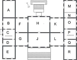 The principal entrance hall, reception and family bedrooms were placed on the first floor above a low semi-basement containing service rooms. The two principal entrances to the mansion in the centre of both the north and south facades were accessed by external staircases, originally a single broad flight on the north side and a double staircase on the south. These staircases have since been replaced by the simpler designs illustrated on the plan (right).