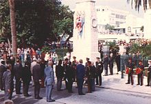 Bermudians served in the British armed forces during both World War I and World War II. After the latter, Major-General Glyn Charles Anglim Gilbert, Bermuda's highest ranking soldier, was instrumental in developing the Bermuda Regiment. A number of other Bermudians and children of Bermudians had preceded him into senior ranks, including Bahamian-born Admiral Lord Gambier, and Bermudian-born Royal Marines Brigadier Harvey, who, when promoted to that rank at age 39, following his wounding at the Anzio landings, became the youngest-ever Royal Marine Brigadier. The Cenotaph in front of the Cabinet Building (in Hamilton) was erected in tribute to Bermuda's Great War dead (the tribute was later extended to Bermuda's Second World War dead) and is the site of the annual Remembrance Day commemoration.