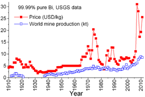 The price for pure bismuth metal has been relatively stable through most of the 20th century, except for a spike in the 1970s. Bismuth has always been produced mainly as a byproduct of lead refining, and thus the price, usually reflected the cost of recovery and the balance between production and demand.