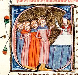 Monks, disfigured by the plague, being blessed by a priest. England, 1360–75
