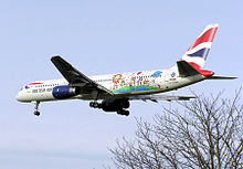 The specially painted Blue Peter British Airways Boeing 757 landing at London Heathrow Airport.