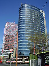 Other prominent 20th-century structures include the Most Slovenského národného povstania (Bridge of the Slovan national uprising) across the Danube featuring a UFO-like tower restaurant, Slovak Radio's inverted-pyramid-shaped headquarters, and the uniquely designed Kamzík TV Tower with an observation deck and rotating restaurant. In the early 21st century, new edifices have transformed the traditional cityscape. The construction boom has spawned new public buildings, such as the Most Apollo and a new building of the Slovak National Theatre, as well as private real-estate development.