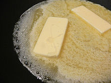 Butter is a dairy product made by churning fresh or fermented cream or milk. It is generally used as a spread and a condiment, as well as in cooking, such as baking, sauce making, and pan frying. Butter consists of butterfat, milk proteins and water.