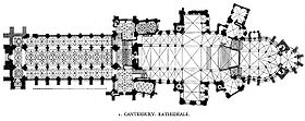 Plan of Canterbury Cathedral showing the richly complicated ribbing of the Perpendicular vaulting in the nave and transepts.