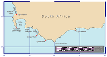 Cape Agulhas is the southernmost point in the continent of Africa. It is located at 34°50′00″S 20°00′09.15″E Coordinates: 34°50′00″S 20°00′09.15″E in the Overberg region, 170 kilometres (105 mi) southeast of Cape Town. The cape was named by Portuguese navigators, who called it Cabo das Agulhas — Portuguese for "Cape of Needles" — after noticing that around the year 1500 the direction of magnetic north (and therefore the compass needle) coincided with true north in the region. The cape is within the Cape Agulhas Local Municipality in the Overberg District of the Western Cape province of South Africa. The official dividing line between the Indian and Atlantic oceans is defined by the International Hydrographic Organization to pass through Cape Agulhas. The nearby small airport of Andrew's Field services Agulhas.