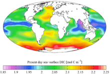 "Present day" (1990s) sea surface dissolved inorganic carbon concentration (from the GLODAP climatology)