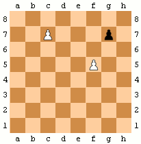 This is one of the most famous chess studies; it was published by Richard Réti in 1921. It seems impossible to catch the advanced black pawn, while the black king can easily stop the white pawn. The solution is a diagonal advance, which brings the king to both pawns simultaneously: