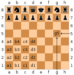 When a pawn advances two squares from its starting position and there is an opponent's pawn on an adjacent file next to its destination square, then the opponent's pawn can capture it en passant (in passing), and move to the square the pawn passed over. However, this can only be done on the very next move, otherwise the right to do so is forfeit. For example, if the black pawn has just advanced two squares from g7 (initial starting position) to g5, then the white pawn on f5 may take it via en passant on g6 (but only on white's next move).
