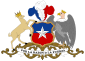 The coat of arms depicts the two national animals: the condor (Vultur gryphus, a very large bird that lives in the mountains) and the huemul (Hippocamelus bisulcus, an endangered white tail deer). It also has the legend Por la razón o la fuerza (By reason or by force).