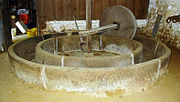 Once the apples are gathered from trees in orchards they are scratted (ground down) into what is called pomace or pommage. Historically this was done using pressing stones with circular troughs, or by a cider mill. Cider mills were traditionally driven by the hand, water-mill, or horse-power. In modern times they are likely to be powered by electricity. The pulp is then transferred to the cider press and built up in layers known as cheeses into a block.