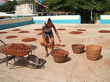 The wet beans are transported then to a facility so they can be fermented and dried. They are fermented for four to seven days and must be mixed every two days. They are dried for five to fourteen days, depending on the climate conditions. The fermented beans are dried by spreading them out over a large surface and constantly raking them. In large plantations, this is done on huge trays under the sun or by using artificial heat. Small plantations may dry their harvest on little trays or on cowhides. Finally, the beans are trodden and shuffled about (often using bare human feet) and sometimes, during this process, red clay mixed with water is sprinkled over the beans to obtain a finer colour, polish, and protection against molds during shipment to factories in the United States, the Netherlands, United Kingdom, and other countries. Drying in the sun is preferable to drying by artificial means, as no extraneous flavours such as smoke or oil are introduced which might otherwise taint the flavor.