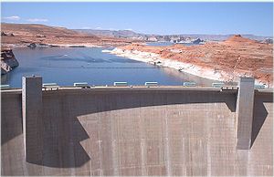 Hoover Dam (originally Boulder Dam, and the first dam of its type) was completed in 1936. Its impoundment of the river in the Mojave Desert creates Lake Mead, which provides water for irrigation and the generation of hydroelectric power.