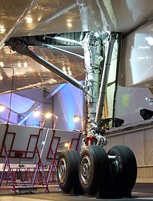 Because of the way Concorde's delta-wing generated lift, the undercarriage had to be unusually strong. At rotation, Concorde would rise to a high angle of attack, about 18 degrees. Prior to rotation the wing generated almost no lift, unlike typical aircraft wings. Combined with the high airspeed at rotation (199 knots indicated airspeed), this increased the stresses on the rear undercarriage in a way that was initially unexpected during the development and required a major redesign. Due to the high angle needed at rotation, a small set of wheels were added aft to prevent tailstrikes. The rear main undercarriage units swing towards each other to be stowed but due to their great height also need to retract telescopically before swinging in order to clear each other when stowed. The four main wheel tyres on each bogie unit are inflated to 232 lb/sq in. The twin-wheel nose undercarriage retracts forwards and its tyres are inflated to a pressure of 191 lb/sq in, and the wheel assembly carries a spray deflector to prevent standing water being thrown up into the engine intakes. The tyres are rated to 250 mph. The starboard nose wheel carries a single disc brake to halt wheel rotation whilst the undercarriage is being retracted. The port nose wheel carries speed generators for the anti-skid braking system which prevents brake activation until nose and main wheels are rotating at the same rate.