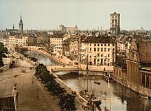 Slotsholmen canal, as seen from Børsen (1890–1900). In the background from left to right: Church of the Holy Ghost, Rundetårn, Trinity Church, St. Nicholas Church (before the spire was rebuilt) and Holmen Church.
