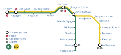 A map of the current Copenhagen Metro network, showing the M1 and M2
