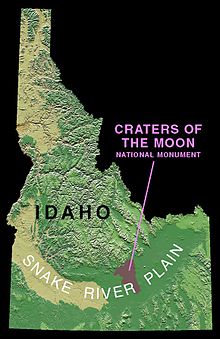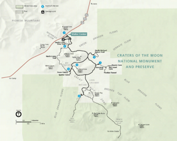 Craters of the Moon National Monument and Preserve is a U.S. National Monument and National Preserve in the Snake River Plain in central Idaho. It is along US 20 ( concurrent with US 93 & US 26), between the small towns of Arco and Carey, at an average elevation of 5,900 feet (1,800 m) above sea level. The protected area's features are volcanic and represent one of the best-preserved flood basalt areas in the continental United States.