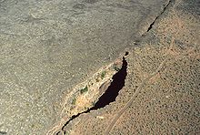 Total average precipitation in the Craters of the Moon area is between 15–20 inches (380–510 mm) per year. Most of this is lost in cracks in the basalt, only to emerge later in springs and seeps in the walls of the Snake River Canyon. Older lava fields on the plain have been invaded by drought-resistant plants such as sagebrush, while younger fields, such as Craters of the Moon, only have a seasonal and very sparse cover of vegetation. From a distance this cover disappears almost entirely, giving an impression of utter black desolation. Repeated lava flows over the last 15,000 years have raised the land surface enough to expose it to the prevailing southwesterly winds, which help to keep the area dry. Together these conditions make life on the lava field difficult.