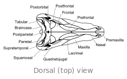 The skull of Dimetrodon is tall and compressed laterally, or side-to-side. The eye sockets are positioned high and far back in the skull. Behind each eye socket is a single hole called an infratemporal fenestra. Two additional pairs of holes can be seen at the back of the skull when viewed from above: the supratemporal fenestra and the posttemporal fenestra. The back of the skull (the occiput) is oriented at a slight upward angle, a feature that it shares with all other early synapsids. The upper margin of the skull slopes downward in a convex arc to the tip of the snout. The tip of the upper jaw, formed by the premaxilla bone, is raised above the part of the jaw formed by the maxilla bone to form a maxillary "step." Within this step is a diastema, or gap in the tooth row.