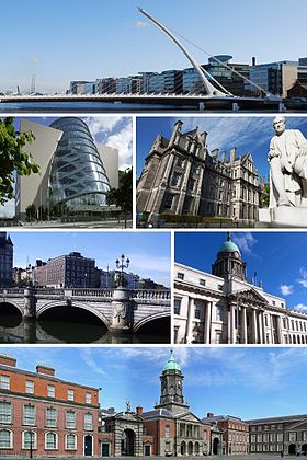 Clockwise from top: Samuel Beckett Bridge, Trinity College, Custom House, Dublin Castle, O'Connell Bridge, and Convention Centre Dublin.